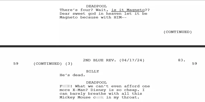 Disney nedávno zveřejnilo scénář ke snímku Deadpool & Wolverine na své platformě Disney Debut. Dokument odhaluje změnu v dialogu uprostřed filmu, ve scéně, kde se Deadpool a Wolverine setkávají s týmem superhrdinů žijících v Pustině. Patří do něj X-23 (Dafne Keen), Elektra (Jennifer Garner), Blade (Wesley Snipes) a Gambit (Channing Tatum). Klíčový moment nastává těsně před představením X-23. Deadpool se snaží uhodnout čtvrtého člena týmu a říká: „Jsou čtyři? Počkej, je to Magneto? Proboha, prosím, ať je to Magneto, protože s ním—“ než ho Blade přeruší strohým: „Je mrtvý.“