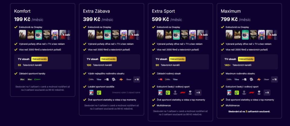 Testovali jsme Oneplay Komfort, což je nejzákladnější varianta nové platformy. Na rozdíl od Voya umožňuje sledování pouze na jednom zařízení, což je nejdiskutovanější změna posledních dnů. Pokud chcete Oneplay využívat na více obrazovkách současně, máte dvě možnosti – připlatit si za Rodinné sledování nebo zvolit nejdražší tarif Maximum.