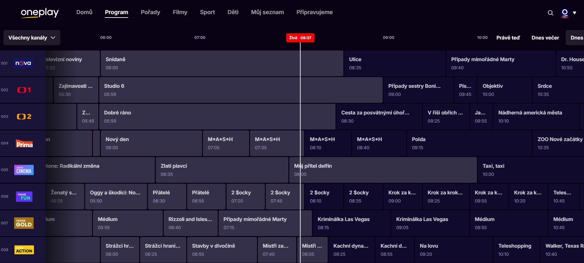Televizní sekce Program se liší podle zvoleného tarifu. V Komfortu je dostupných 55 základních kanálů, včetně Nova Sport 1 a 2 a ČT Sport. Rolování mezi stanicemi by mohlo být svižnější, ale při menším počtu programů nejde o zásadní problém. Uživatelé s tarifem obsahujícím až 140 kanálů to mohou vnímat jinak. Výhodou je možnost řazení kanálů podle oblíbenosti – stačí si stanici označit hvězdičkou a zobrazí se na začátku seznamu.